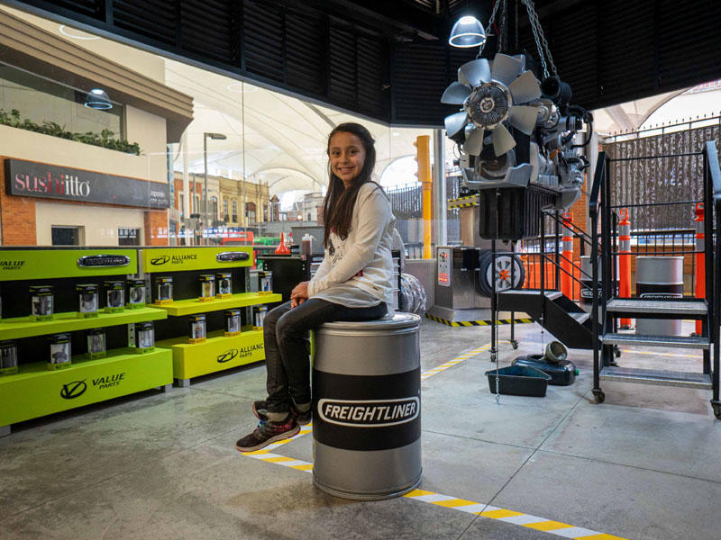 En este nuevo espacio de Freightliner los niños tienen la oportunidad de descubrir cómo funciona un taller mecánico para camiones y tractocamiones, así como conocer sus componentes y refacciones de la mano de Alliance Parts y Value Parts, que incluyen desde compresores, faros y amortiguadores hasta réplicas de motores. De esta forma, podrán comprender la importancia de que las unidades se encuentren en óptimas condiciones para garantizar la seguridad de las personas, y así obtener su certificado como ingenieros mecánicos.